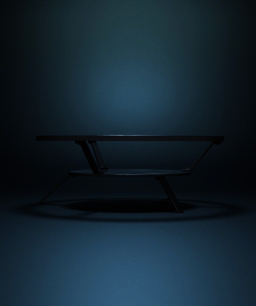 Seen from above, these surface accidents form the outline of a moon, like a celestial disc held within the structure. The table becomes both furniture and image, somewhere between functional object and discreet sculptural presence. The cold appearance of the materials contrasts with the role of the coffee table itself, an object that people naturally gather around to share a moment.